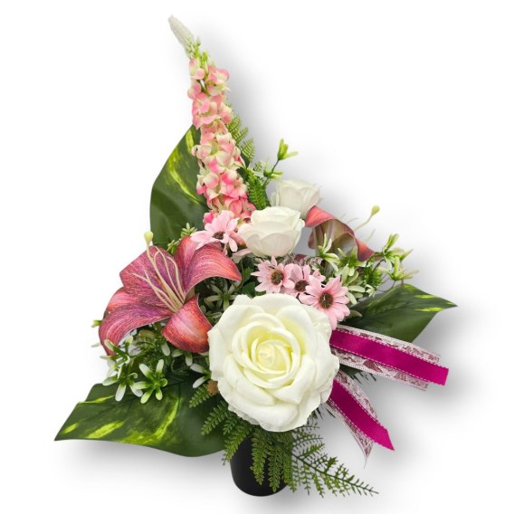 Kompozycje nagrobne z obciążeniem z wysokiej jakości sztucznych kwiatów i roślin.