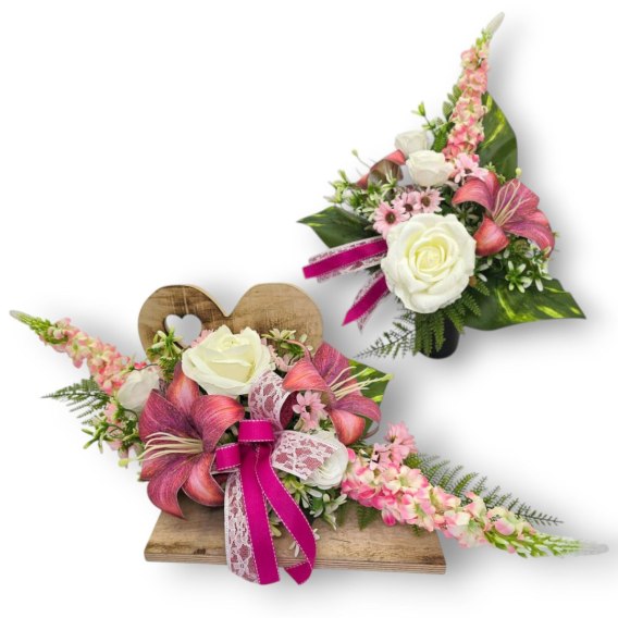 Ten komplet został przygotowany z myślą o spójnej i eleganckiej dekoracji nagrobka. Stroik i bukiet tworzą harmonijną całość, która w piękny sposób podkreśli pamięć o bliskich, zapewniając uroczysty i zadbany wygląd pomnika.