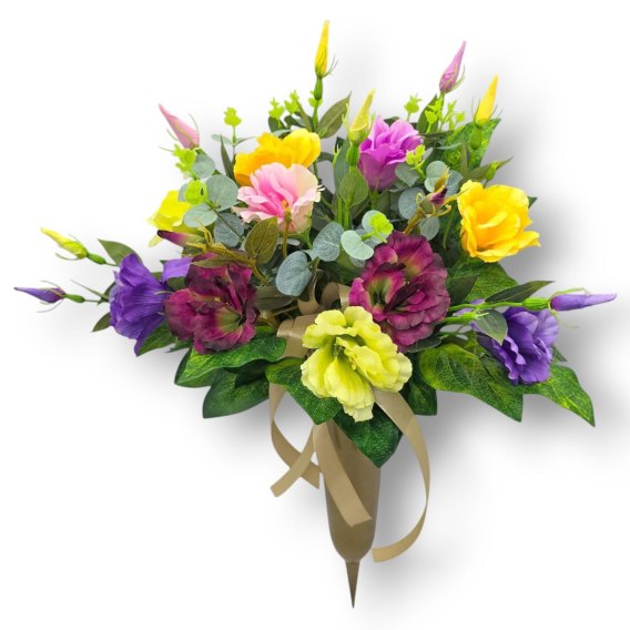 Estetyczny i trwały bukiet sztucznych kwiatów przeznaczony do wbijania w ziemię. Kompozycja umieszczona jest w wazonie na stabilnym plastikowym szpikulcu, co ułatwia umiejscowienie bukietu przy grobie, kapliczce lub krzyżu. Wazon jest obciążony betonem. Naturalny wygląd kwiatów oraz gustowny dodatek w postaci wstążki sprawiają, że dekoracja prezentuje się elegancko i schludnie przez długi czas - niezależnie od warunków atmosferycznych.