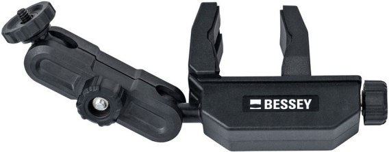 Uchwyt obrotowy w kształcie litery L z dwiema osiami obrotu: 360° obok klamry zaciskowej, 180° przy mocowaniu gwintowym
